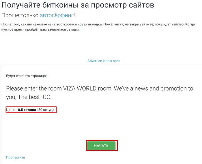 Окно нельзя закрывать пока идет таймер! Обычно время просмотра сайта от 10 до 60 секунд.