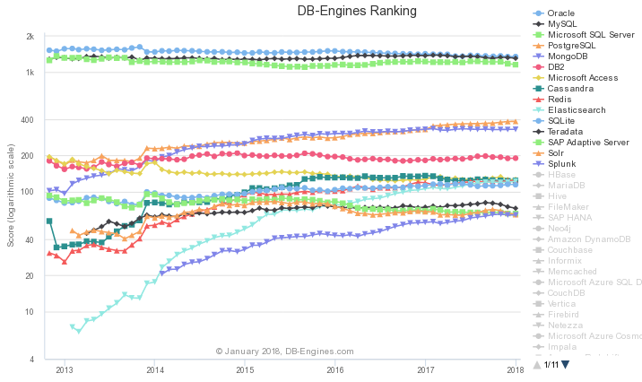 Наибольший рост популярности за год отмечается для СУБД PostgreSQL, которая заняла 4 место, вытеснив на пятое место MongoDB. За год проект PostgreSQL набрал 55.81 баллов, в то время как Oracle потерял 74.78 баллов, MySQL потерял 66.58 баллов, а MS SQL Server потерял 72.89 балла. Спад популярности также наблюдается для систем SQLite, CouchDB, Cassandra и Redis. Растёт популярность Firebird и MariaDB.