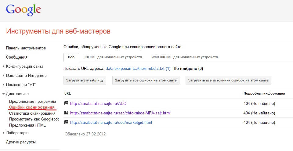 На мой взгляд одной из самых важных особенностей этих сервисов является то, что они указывают ошибки сканирования на сайта. Скриншот из Google Вебмастер: