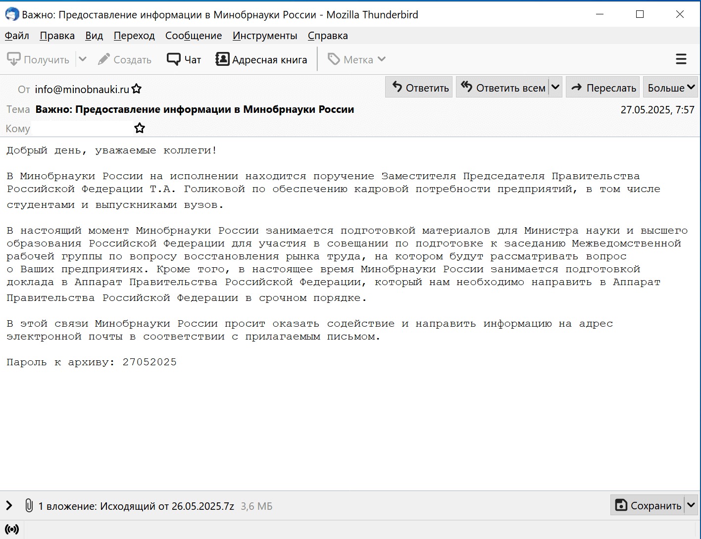 Исследователи рассказывают, что группировка TA Tolik отправляла фишинговые письма с архивом, внутри которого был вредоносный файл, замаскированный под официальный документ или уведомление от государственных органов.