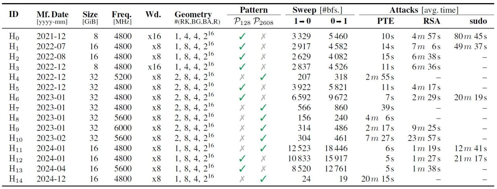 Как видно из таблицы выше, все протестированные чипы памяти оказались уязвимы хотя бы перед одним из Rowhammer-паттернов атаки Phoenix. Более короткий паттерн с 128 интервалами обновлений оказался эффективнее и в среднем генерирует больше «переворотов».