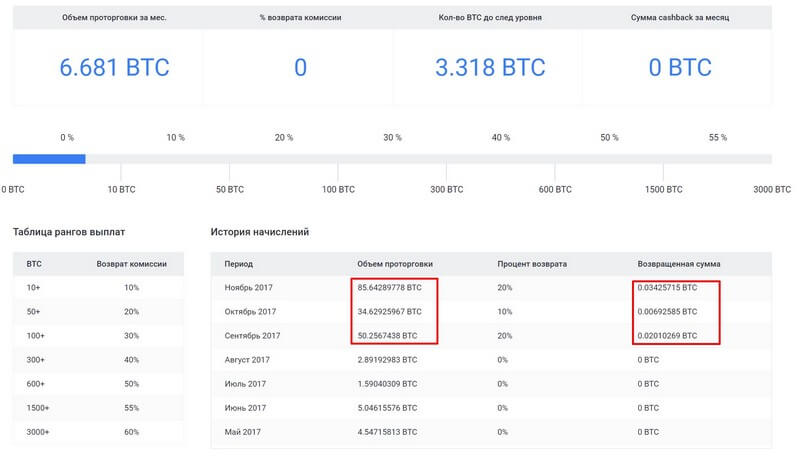 - Есть система бонусов (CashBack) за торговый оборот от 10 BTC