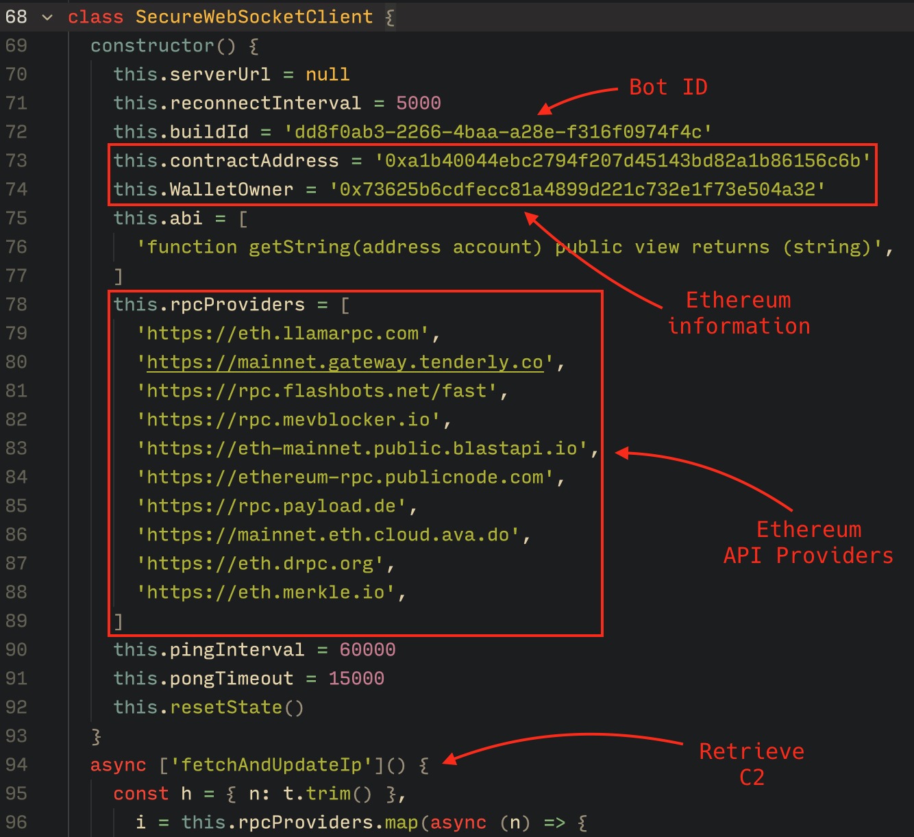 По данным исследователей, ботнет использует смарт-контракты для хранения зашифрованных конфигураций. Чтобы сменить управляющий сервер, операторы малвари совершают транзакцию на 0 ETH, записывая в переменную состояния контракта новый адрес WebSocket-сервера. Бот обращается к публичным RPC-конечным точкам Ethereum, анализирует транзакции и извлекает актуальный C2-адрес.