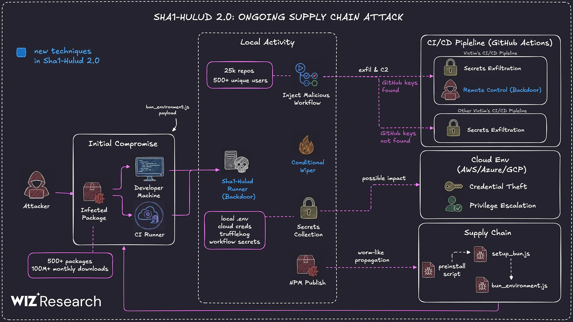 В новой версии червя (Shai-Hulud 2.0) ключевым отличием является выполнение вредоносного кода на стадии pre-install, что значительно увеличивает риски.