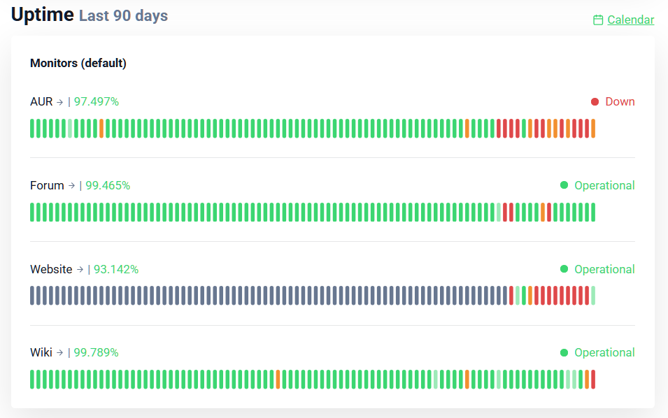 Однако справиться с атакой быстро не удалось. Хотя в минувшие выходные сервисы практически восстановили свою работоспособность, в настоящее время проблемы сохраняются и периодически работа ресурсов ухудшается, как видно на статус-странице проекта. При этом отмечается, что некоторые сервисы могут ошибочно отображаться как недоступные из-за использующихся тактик защиты.«Как вы могли заметить, некоторые из наших сервисов (AUR, форумы, основной сайт) в настоящее время затронуты DDoS-атакой. Мы знаем о проблеме и активно работаем над мерами по ее устранению», — писали мейнтейнеры 16 августа.