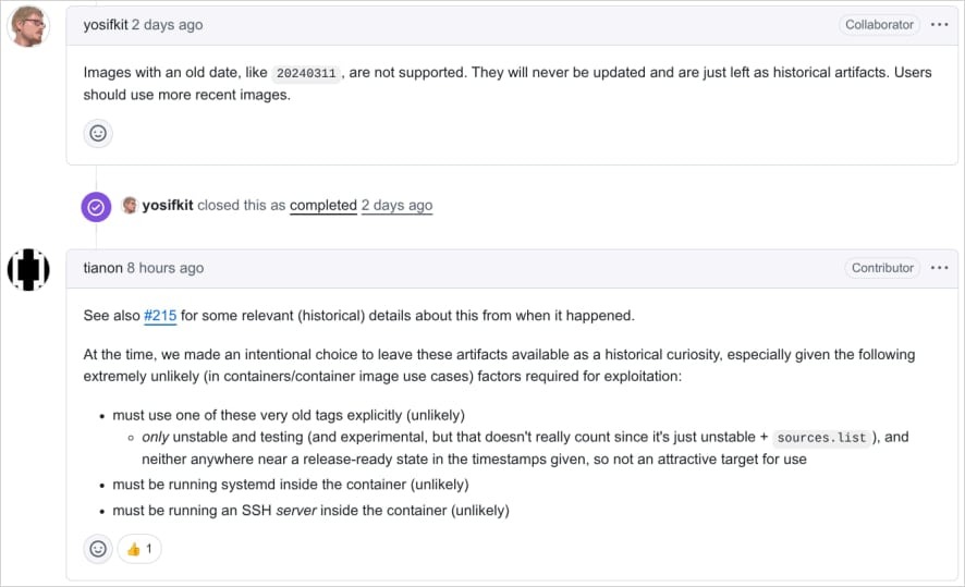 В ответ на это в Debian заявили, что намеренно решили не удалять эти образы из репозитория и сохранили их как исторические артефакты. При этом пользователям настоятельно рекомендуется работать только с актуальными образами, а не со старыми.