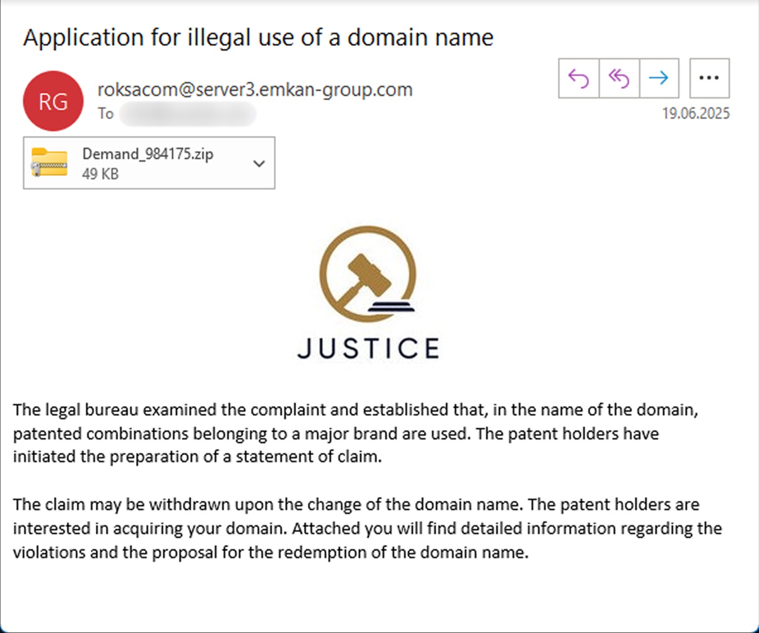 В фишинговых письмах говорится, что юристы некой корпорации проверили домен, принадлежащий получателю, и заметили, что в его названии есть слова или фразы, якобы уже зарегистрированные этой организацией. Юристы якобы собираются подать в суд, но могут этого не делать, если владелец сменит название домена. Более того, они даже готовы выкупить этот домен.