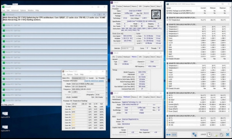 В инструкции Gigabyte обращает внимание на довольно «горячий нрав» процессора Core i9-9900K. На одном из скриншотов видно, что в разгоне до 5 ГГц температура процессора составила 90 °C. И это несмотря на использование системы жидкостного охлаждения. Также стоит отметить, что энергопотребление одного лишь процессора при таком разгоне составило почти 245 Вт. Заметим также, что 5 ГГц — это не такой уж и большой разгон для этого процессора, так как в режиме Turbo все его ядра должны работать с частотой до 4,7 ГГц.