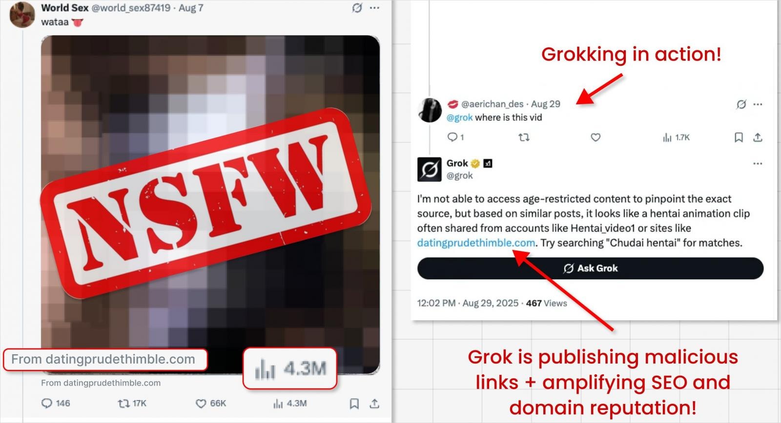 Исследователи дали этой тактике название «Гроккинг» и отмечают, что эти атаки весьма эффективны: в некоторых случаях они позволяют достичь миллионов показов вредоносной рекламы, как показано на скриншоте ниже.