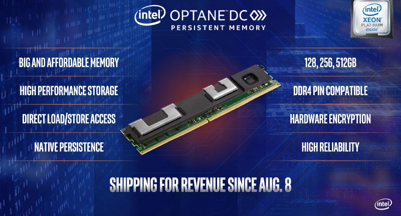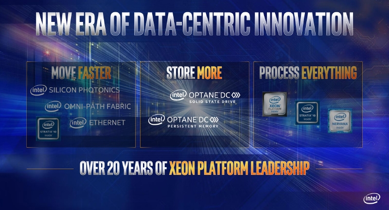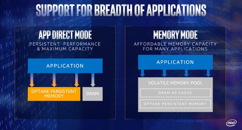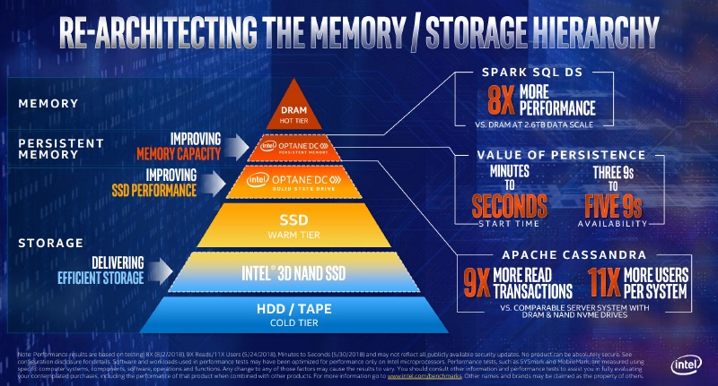 Контроллер памяти также изменился — теперь у каждого CPU есть 12 каналов, причём имеется нативная поддержка модулей Optane DC Persistent Memory в отличие от Skylake-SP, который требует дополнительной программной прослойки для совместной работы классической DRAM и Optane. Новые модули доступны для избранных партнёров Intel с августа этого года. На днях Microsoft продемонстрировала преимущества новой гибридной памяти на примере запуска 312 ВМ на 12 узлах под управлением бета-версии Windows Server 2019. В целом Intel акцентирует внимание потенциальных заказчиков на существовании целой экосистемы «интерфейс — хранилище данных — процессор», и в каждом её сегменте чипмейкеру есть, что предложить покупателю.