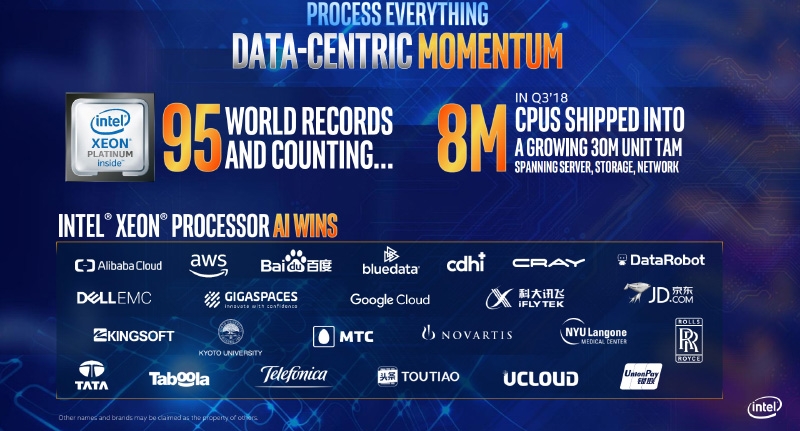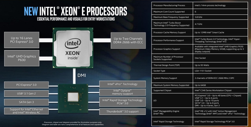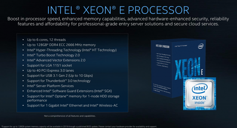 Кроме того, компания напомнила о Xeon-E для недорогих однопроцессорных серверов и рабочих станций. Это семейство CPU было представленолетом и может предложить только шестиядерные модели. Все они используют архитектуру Coffee Lake, возможности которой хорошо изучены. Intel особо подчёркивает наличие расширений SGX, поскольку у процессоров Coffee Lake отсутствует нативная защита от Meltdown и Spectre. Упомянутую на слайде поддержку 128 Гбайт RAM вместо текущих 64 Гбайт эти чипы получат в начале 2019 года путём обновления BIOS.