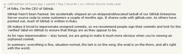 Однако в сообщении, опубликованном на YCombinator Hacker News, Фридман заявил, что исходники выложил не он, а GitHub не подвергался каким-либо компрометациям. По его словам данная утечка включает не весь код GitHub, а только GitHub Enterprise Server. Данный продукт предназначен для компаний, с его помощью они могут запускать GitHub Enterprise на своих локальных серверах, если, к примеру, по соображениям безопасности им необходимо хранить исходники локально.