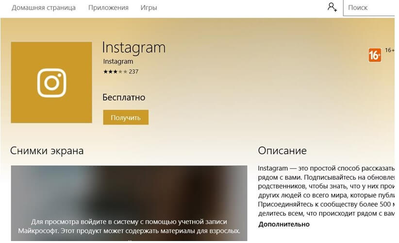 В магазине дополнений Windows 10 вы свободно сможете отыскать официальное и безвозмездное дополнение Instagram для ПК, ноутбука либо планшета.