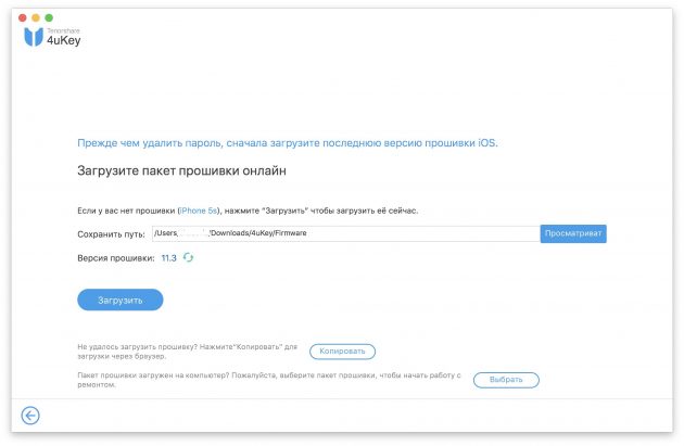 4. Соглашаемся с предложением 4uKey скачать актуальную прошивку для вашего устройства и нажимаем кнопку «Загрузить».