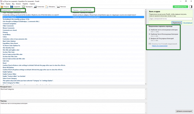 4. Теперь вам потребуется перевести тему в интерфейсе PoEdit. Вы увидите две ячейки в окне программы: в первой — оригинальный текст, во второй — его перевод. Также в правой части экрана вы найдете предлагаемые варианты перевода.