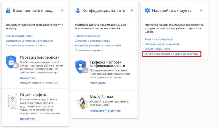 Найти ссылку «Отключение сервисов и удаление аккаунта» и выполнить переход по ней.