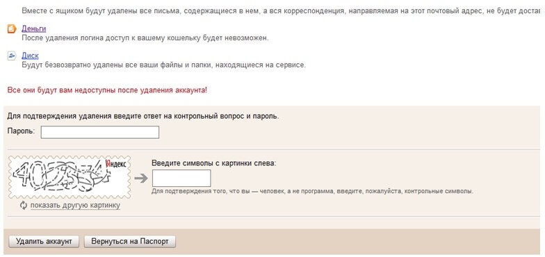 Ввести пароль от почты и капчу для окончания удаления учётной записи Яндекс.