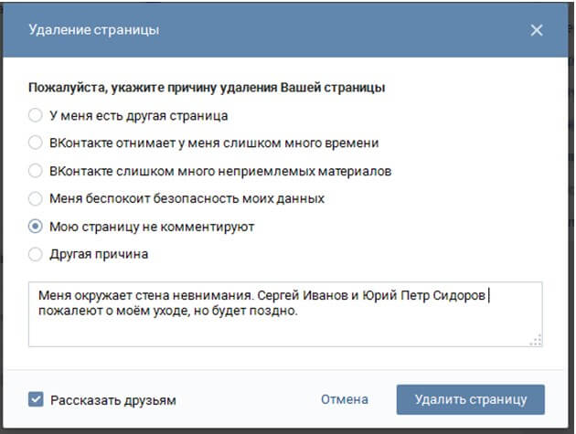 3. Далее выберите причину удаления страницы "Мою страницу не комментируют".