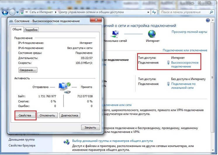 2. Выбрать действующее подключение и нажать на «Свойства»;