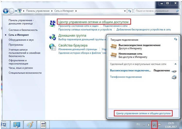 1. Открыть «Центр управления сетями и общим доступом» через Панель Управления или же вызвав окошко с помощью иконки сетевых подключений;