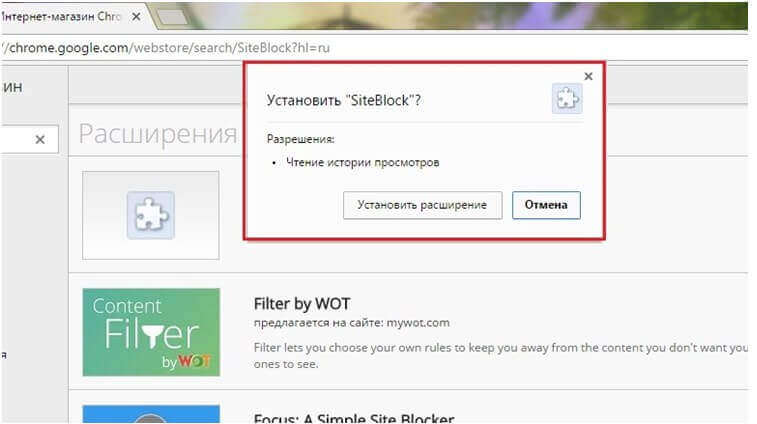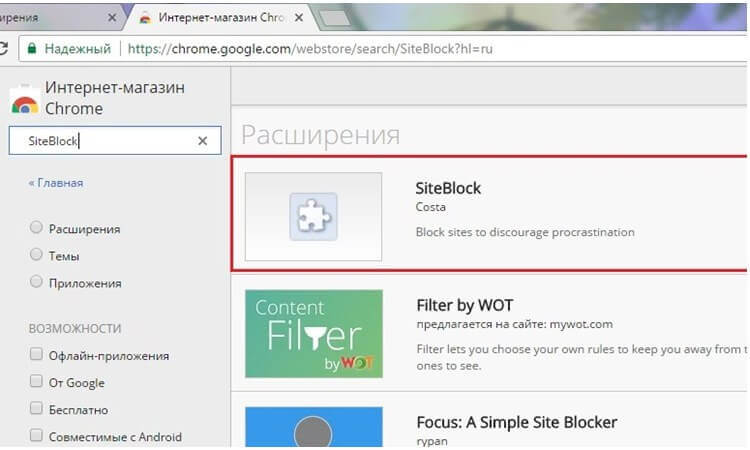 3. Когда откроется интернет-магазин Chrome, ввести в поисковой строке название требуемого расширения – SiteBlock, к примеру;