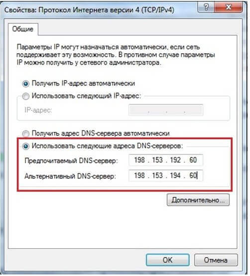 4. Адреса в пунктах «Предпочитаемый DNS-сервер» и «Альтернативный» изменить, к примеру, на значения NORTON DNS, то есть на «198.153.192.60» и «198.153.194.60» соответственно;