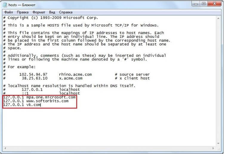 3. С новой строки вписать «127.0.0.1» и IP запрещённого ресурса, вставив пробел;