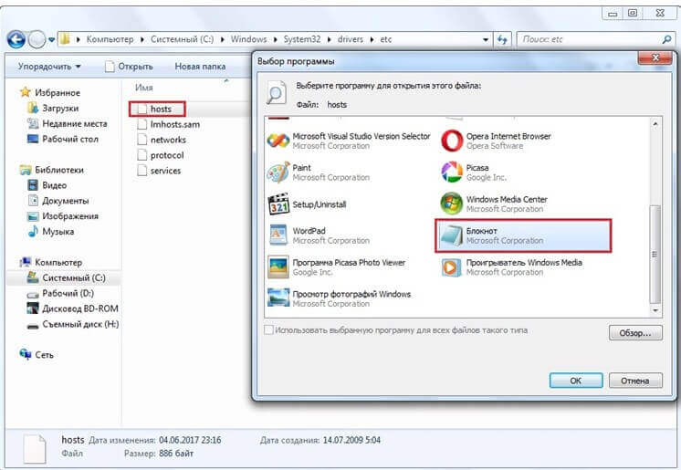 2. Выделить файл реестра hosts и запустить его, используя программу «Блокнот»;