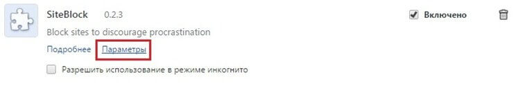 5. Вернувшись во вкладку «Расширения», нажать на «Параметры» самого плагина и прописать адреса нежелательных сайтов.