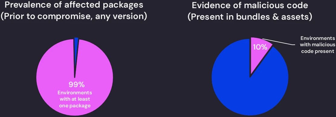 За несколько часов, когда вредоносные версии пакетов были доступны для загрузки, их успели скачать примерно из 10% облачных сред. Стоит отметить, что это подсчеты основаны на данных их облачных сред клиентов Wiz, а также на информации из открытых источников.