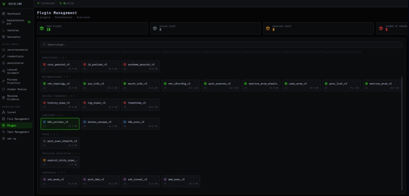 - API для разработки плагинов. VoidLink предлагает развитый API, который инициализируется при запуске малвари.