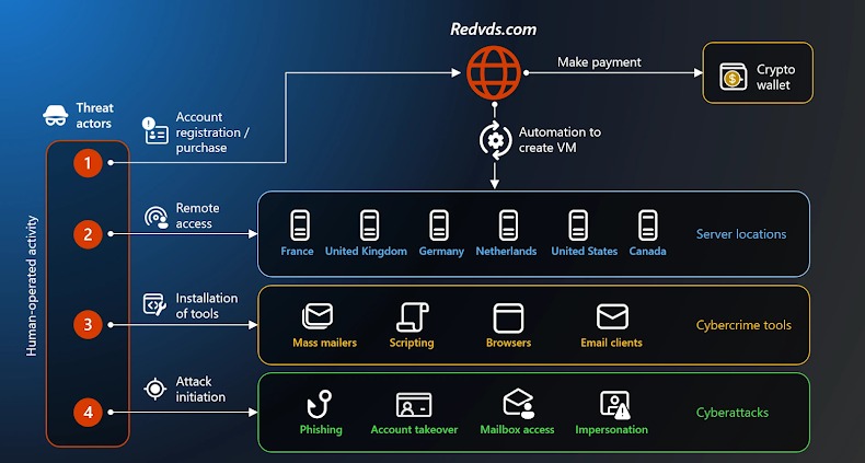 RedVDS был активен с 2019 года, используя домены redvds[.]com, redvds[.]pro и vdspanel[.]space. Сервис продавал доступ к виртуальным Windows-серверам с правами администратора и без каких-либо ограничений по использованию. По информации исследователей, клиентами платформы были несколько хак-групп, которые Microsoft отслеживает как Storm-0259, Storm-2227, Storm-1575 и Storm-1747.
