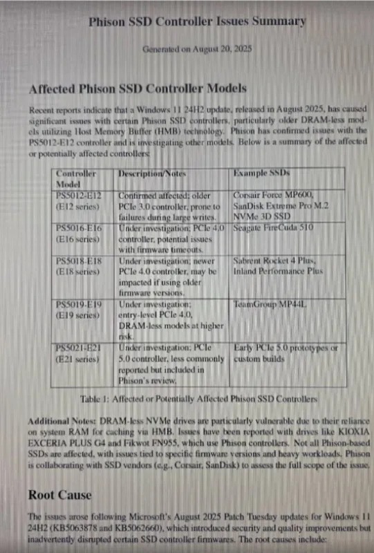 Как пишет издание Tom's Hardware, вскоре после появления информации о сбоях в работе SSD и HDD, в сети распространился документ со списком контроллеров Phison, предположительно затронутых этой проблемой.
