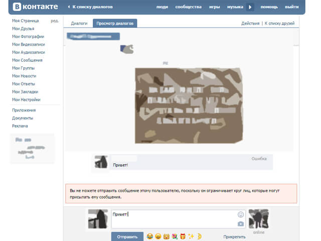 - Собеседник изменил настройки приватности. К сожалению, ничто не поможет, если человек, которому вы хотите написать, изменил настройки своего профиля. Попробуйте найти другие способы связаться с ним, например, отправьте запись на его стену, прокомментируйте опубликованные материалы. Но если пользователь добавил вас в «чёрный список», то доступ к его странице будет полностью закрыт. Свяжитесь с ним через общих друзей или другие социальные сети.