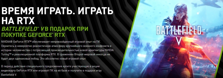 Компания NVIDIA начала рекламную акцию, в рамках которой каждый покупатель видеокарты GeForce RTX 20-й серии сможет бесплатно получить цифровую копию новой игры Battlefield V.