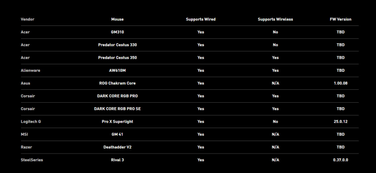 Совместимость заявлена у трёх мышек Acer: Acer GM310, Predator Cestus 330 и Predator Cestus 350. У компании Alienware такую поддержку пока получила только одна игровая мышь — AW610M. Также в список вошли ASUS Chakram Core, Corsair DARK CORE RGB PRO и RGB PRO SE, Logitech G Pro X Superlight MSI GM 41, Razer Death Adder V2 и SteelSeries Rival 3.
