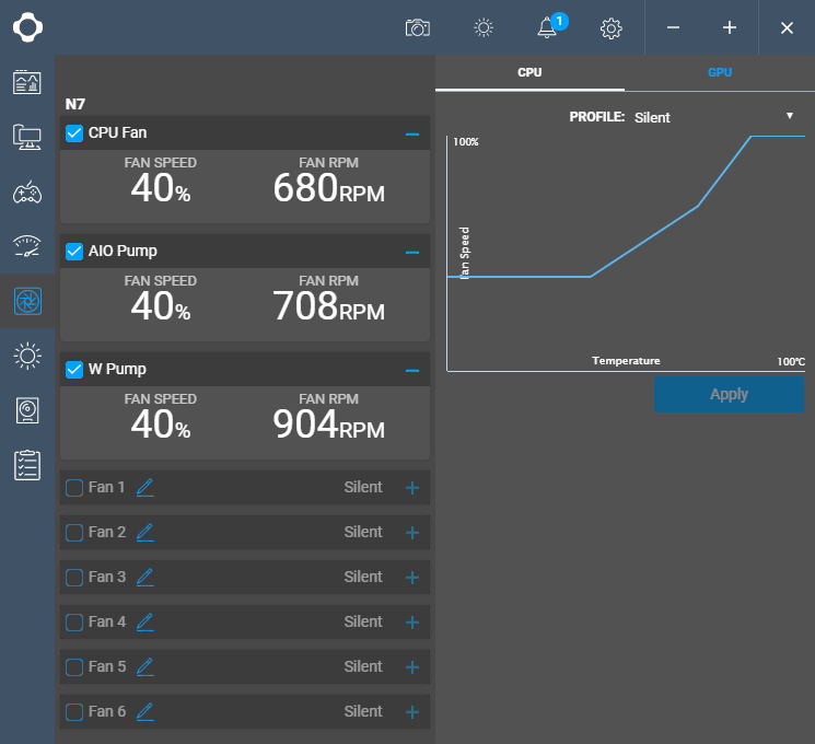 На четвёртой вкладке доступна настройка всех подключенных к плате вентиляторов, причём, в отличие от BIOS, здесь можно настраивать скорость вращения вентиляторов в зависимости от температуры по кривым, а также сохранять профили настроек.