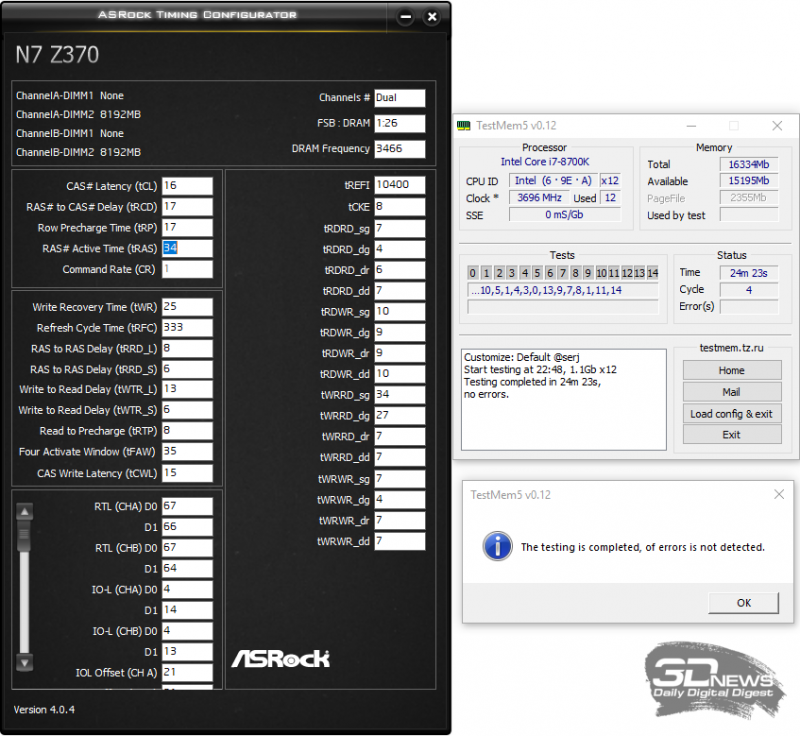 Всё, что осталось попробовать дальше, это проверить разгон двухканального комплекта памяти ADATA XPG Spectrix D41 на данной плате, тем более что заявленные в его XMP частоты 4,4 и 4,6 ГГц очень даже впечатляют. Однако и здесь удача обошла плату NZXT N7 Z370 стороной, поскольку, как мы уже упоминали выше, ни с одним профилем плата не стартовала, а вручную удалось добиться довольно скромных по современным меркам 3,466 ГГц при напряжении 1,35 В с таймингами 16-17-17-34 CR1.