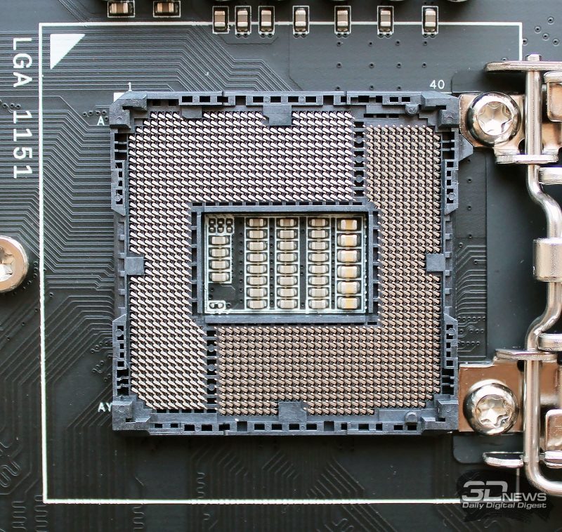 По сложившейся традиции, осмотр платы начнём с процессорного разъёма конструктивного исполнения LGA1151-v2, который здесь совершенно стандартный — без позолоты контактных иголок или отверстия под термодатчик в центре.