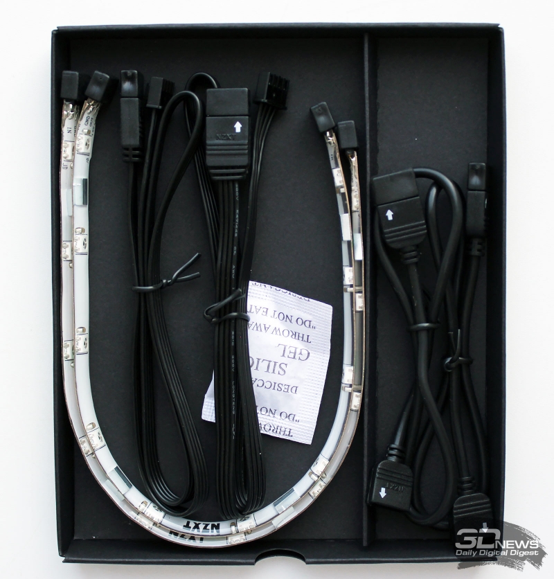 Кроме того, в отдельной чёрной коробочке находятся две ленты светодиодной подсветки и кабели для подключения и управления ей.