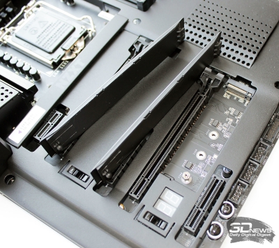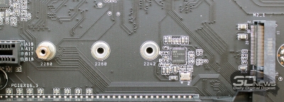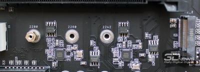 Радиаторов для накопителей в этих портах у платы, к сожалению, нет, но для верхнего радиатором может являться сам металлический кожух платы, если удастся подобрать термопрокладку нужной толщины. С другой стороны, это вообще не слишком-то удобно, когда установка или снятие накопителя в порт M.2_1 сопряжена с необходимостью снимать с платы весь кожух.