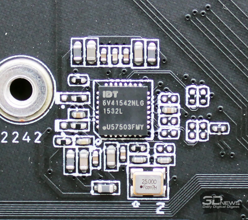 Кроме того, NZXT N7 Z370 оснащена внешним тактовым генератором частоты BCLK, что также говорит о принадлежности платы к флагманским решениям. Его роль здесь играет микропроцессор IDT 6V41542NLG.