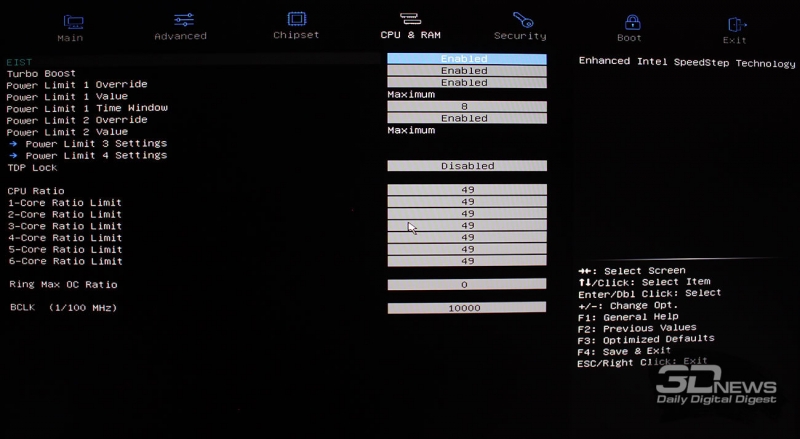 В разделе процессорных настроек можно задать лимиты питания, множители для процессора в целом и для каждого его ядра в отдельности, а также отрегулировать BCLK.