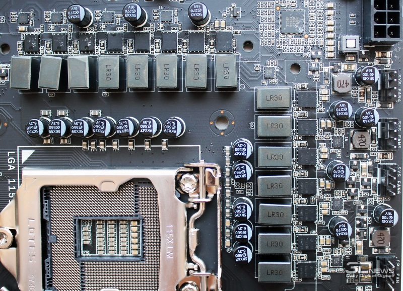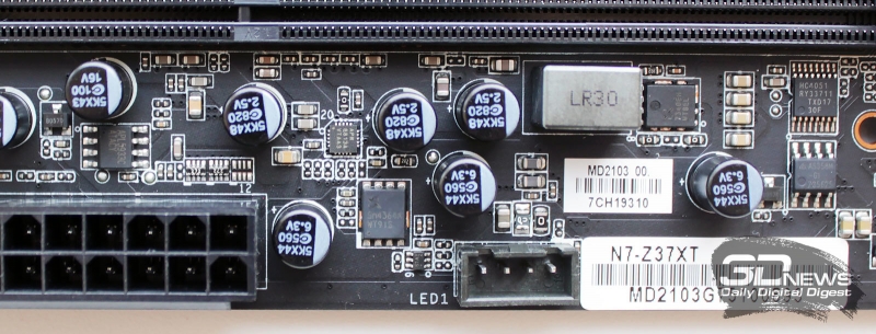 Система питания процессора сравнительно мощная, такая чаще всего используется только на платах верхнего ценового сегмента. Всего в цепи питания заявлены 15 фаз, но почти все они реализованы удвоителями с интегрированными драйверами. Восемь фаз отведены на ядро процессора (Vcore), четыре – на встроенное графическое ядро (Vgpu), две – на VCCSA и одна на VCCIO.