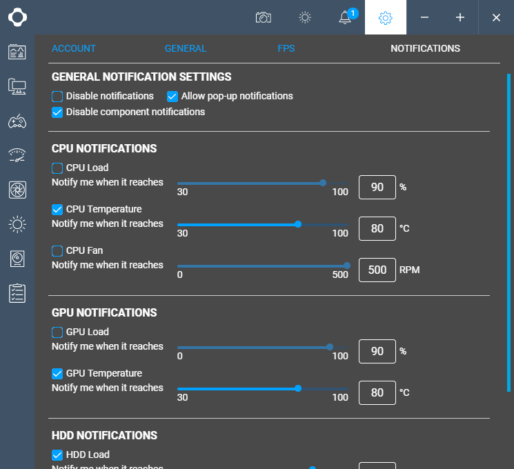 Утилита имеет множество настроек уведомлений, активирующихся по достижении заранее заданных параметров. Их регулировка доступна в разделе Notifications.