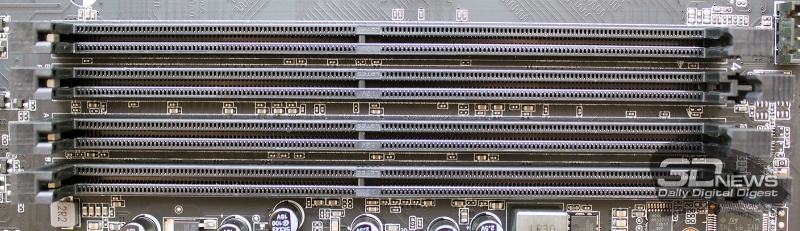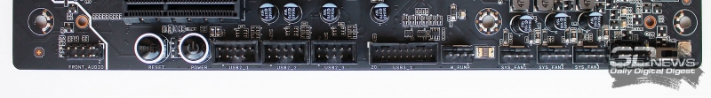 Также нижний край текстолита платы содержит внутренний аудиоконнектор, три разъёма USB 2.0, один USB 3.0, четыре разъёма для вентиляторов и группу коннекторов передней панели корпуса.