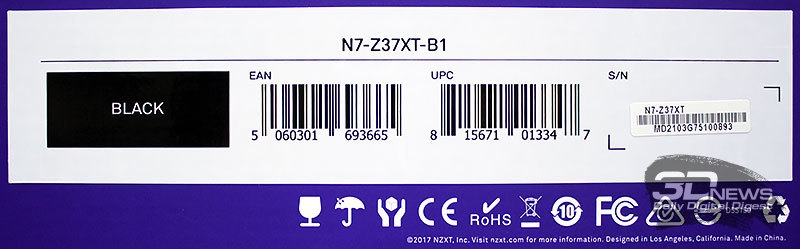 Материнская плата NZXT N7 Z370 поставляется в коробке стандартных для плат размеров, оформленной в светлых тонах. Белый цвет коробки с фиолетовыми вставками и фотографиями платы резко выделяет её из других продуктов данной области и определённо привлекает к себе внимание. Отметим лаконичность лицевой стороны коробки, где приведены лишь название модели платы и её фото.