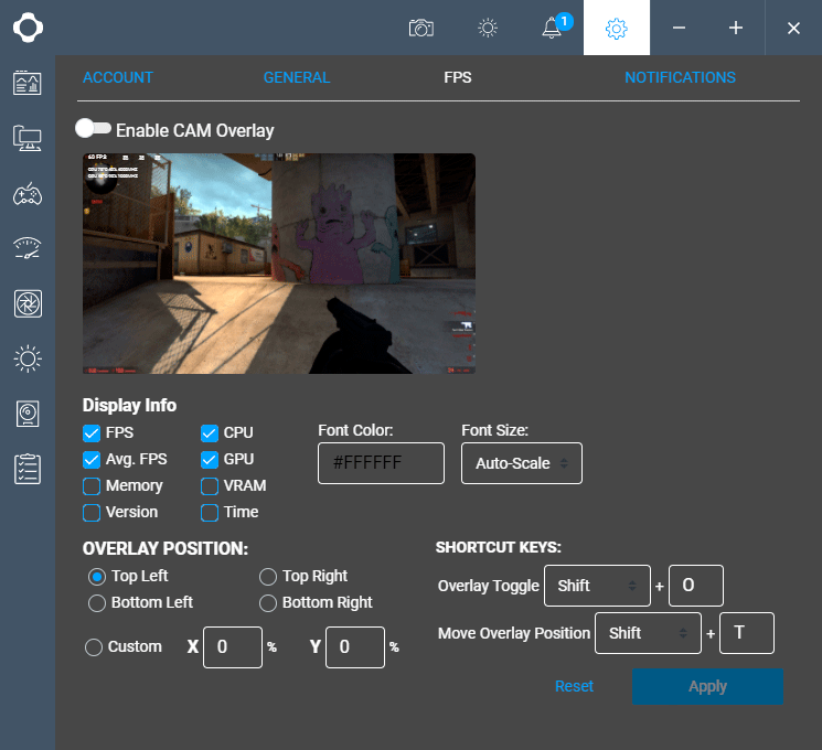 На второй можно скорректировать настройки самой утилиты, а также активировать оверлей в играх с выводом выбранных показателей мониторинга.