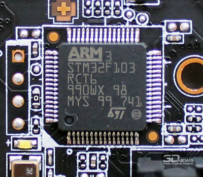 На плате распаян микропроцессор STM32F103RC, обеспечивающий работу подсветки и подключаемых к плате вентиляторов.