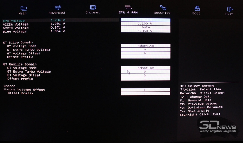 Следующий подраздел включает в себя регулировку напряжений процессора и оперативной памяти. Также здесь доступно изменение напряжения встроенного в процессор графического ядра (при его наличии) и Uncore.